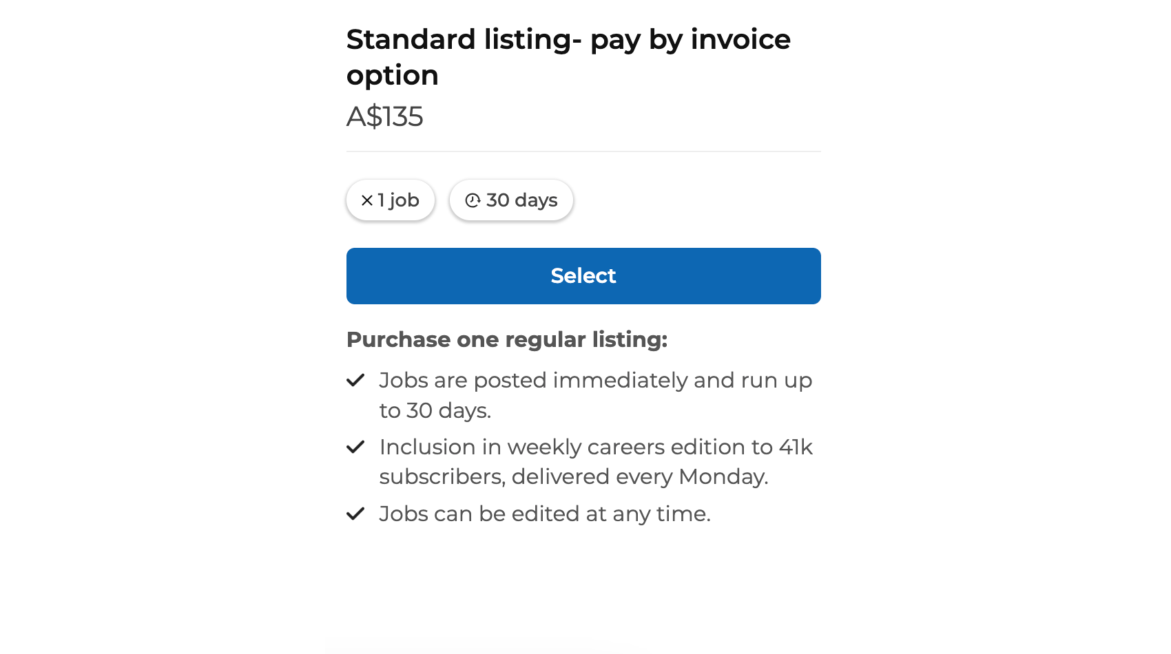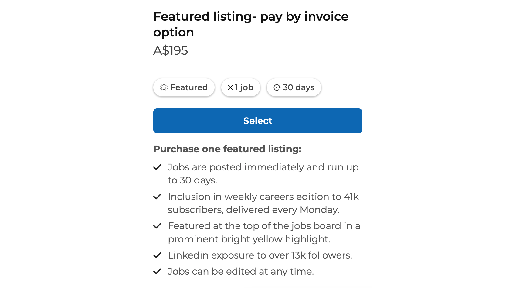 Whilst we are mainly set up and prefer for credit card payments, if you wish to pay for a job by invoice, select the standard or featured listing- pay by invoice option upon checkout